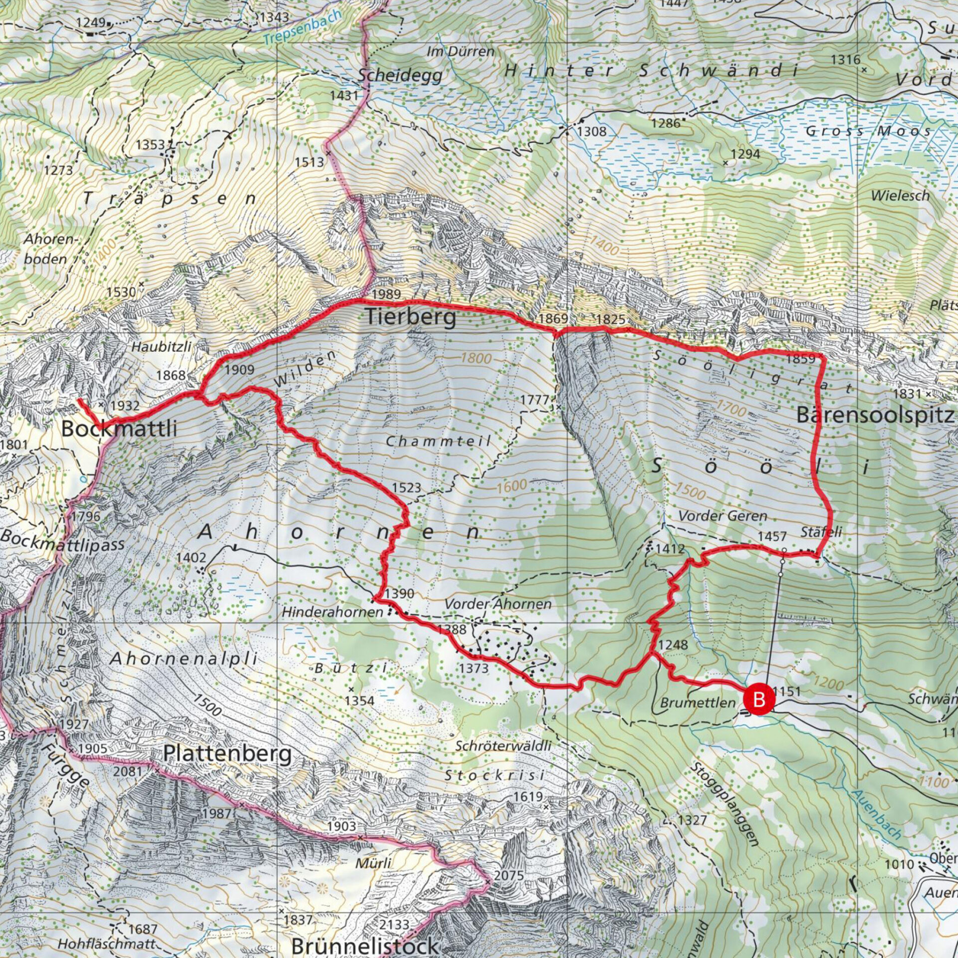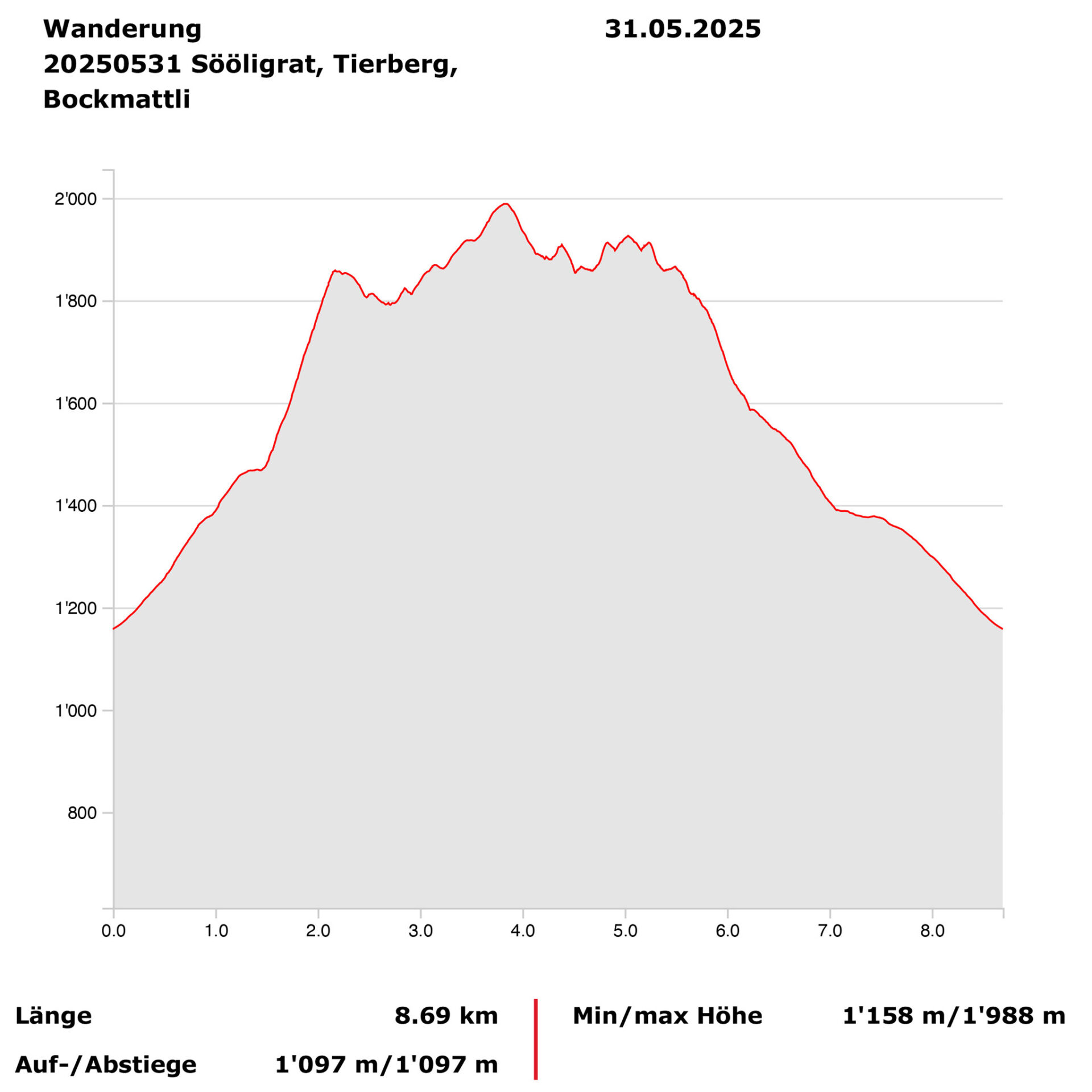 Von Brumettlen über der Oberseealp, 09:00 Uhr, 1151 müM, auf dem Wanderweg hinauf auf die Alp Stäfeli, 10:00 Uhr, 1457 müM. Von dort zuerst weglos den steilen Wiesenhang hoch, dann durch Heidelbeersträucher und Alpenrosen mühsam hoch zum Sööligrat, 12:00 Uhr, 1859 müM. Nach einer Pause über den Sööligrat Richtung Westen zum Pt. 1869 und dann über den Chamm zum Tierberg, 14:00 Uhr, 1989 müM. Eine kurze Pause dann weiter den Wildchamm hinunter zu Pt 1868 und wieder hinauf über den Grat zum Bockmattli, 15:50, 1932 müM. Hier nochmal eine Pause und die herrliche Aussicht auf den Wägitalersee genossen. Nun wieder zurück zum Pt 1868 und von dort der steile Abstieg durch die Wiesenhänge nach Hinter Ahornen, 17:35 Uhr, 1390 müM. Nun noch auf der Alpstrasse hinunter zum Auto bei Brumettlen, 18:00 Uhr, 1151 müM. Zum Abschluss noch im Berghotel Obersee zu einen feinen z’Nacht eingekehrt.